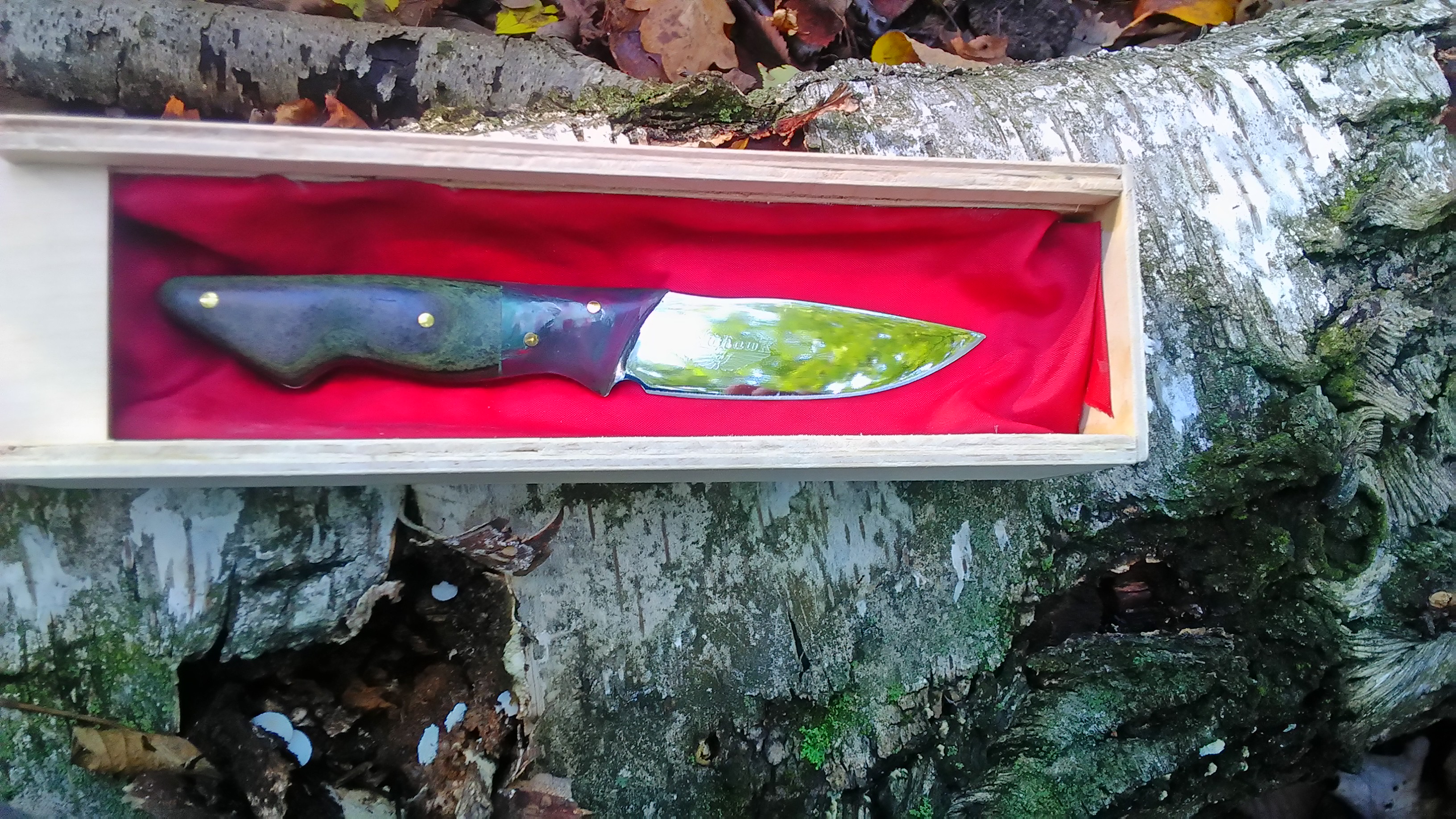 Egyedi kézi készítésű vadásztőr, fa díszdobozban. Anyaga 3mm vastag 1.4116-os rozsdamentes acél (Német acél). Teljes hossza 23cm, ebből a penge hossza 10.5cm.