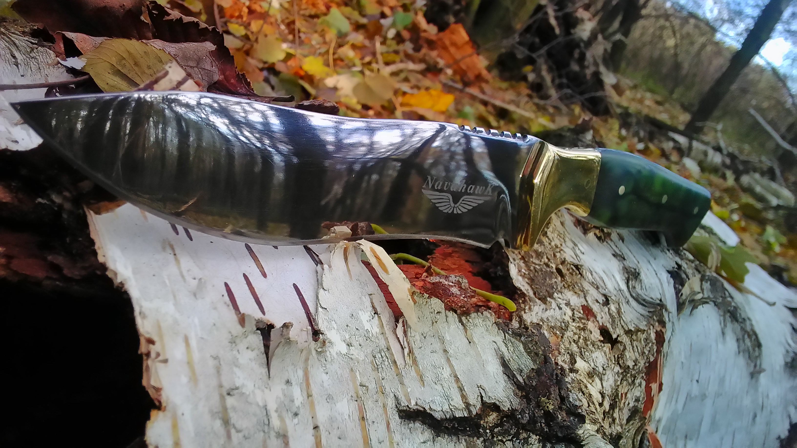 Egyedi kézi készítésű NavahawK kis vadászkés, fa díszdobozban. Anyaga 2.5mm vastag 1.4116-os rozsdamentes acél (Német acél). Teljes hossza 18cm, ebből a penge hossza 8cm.