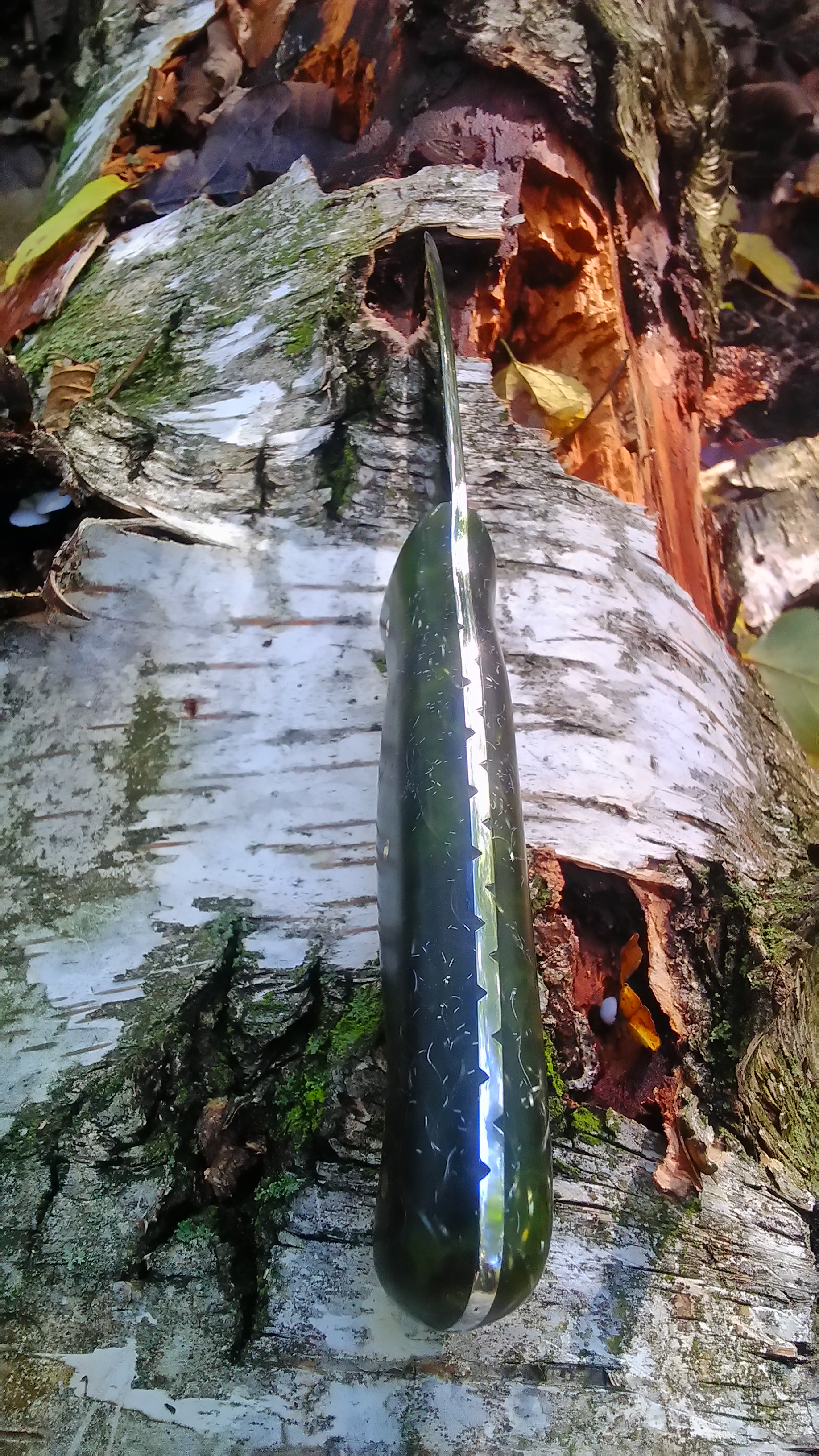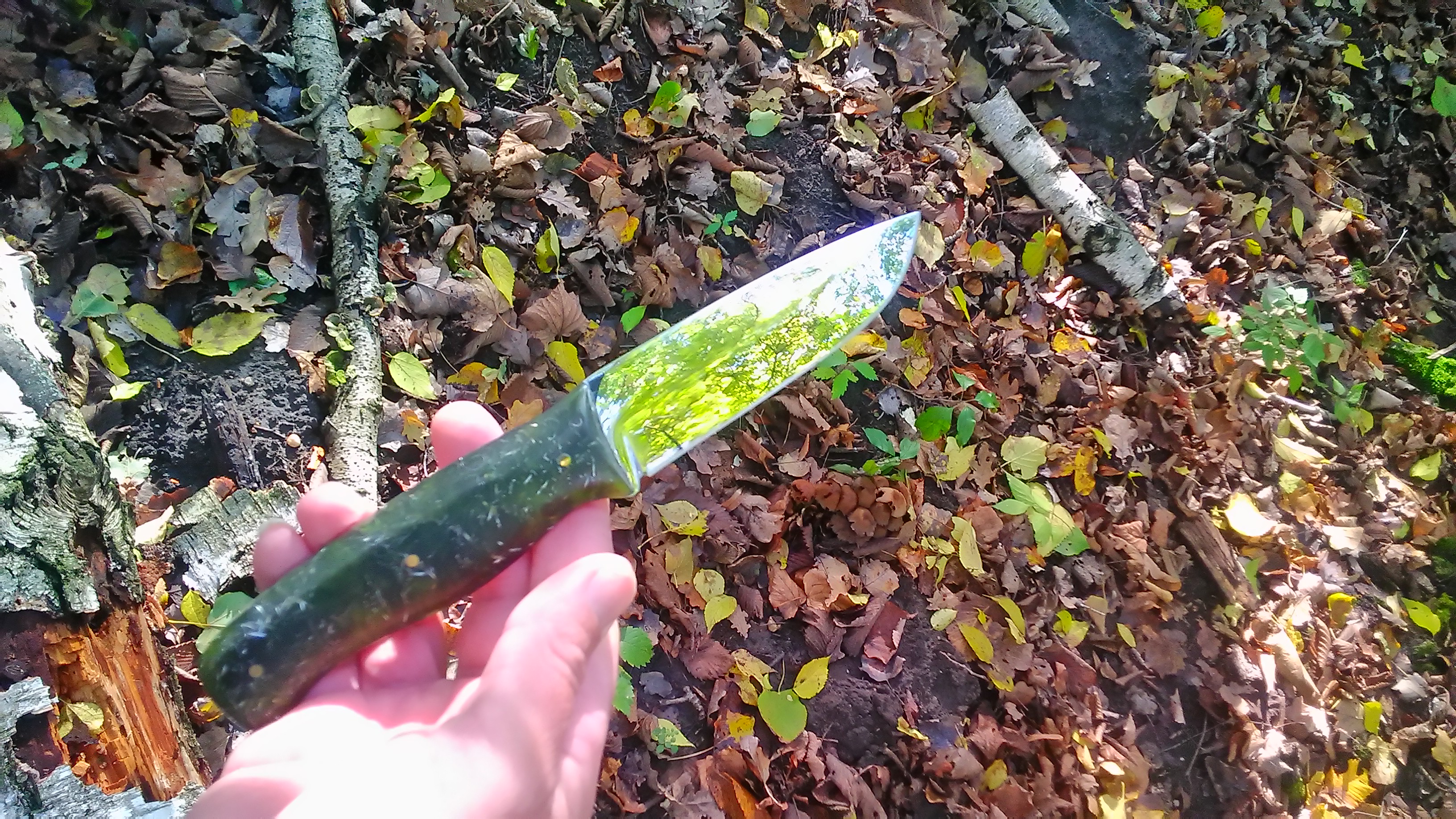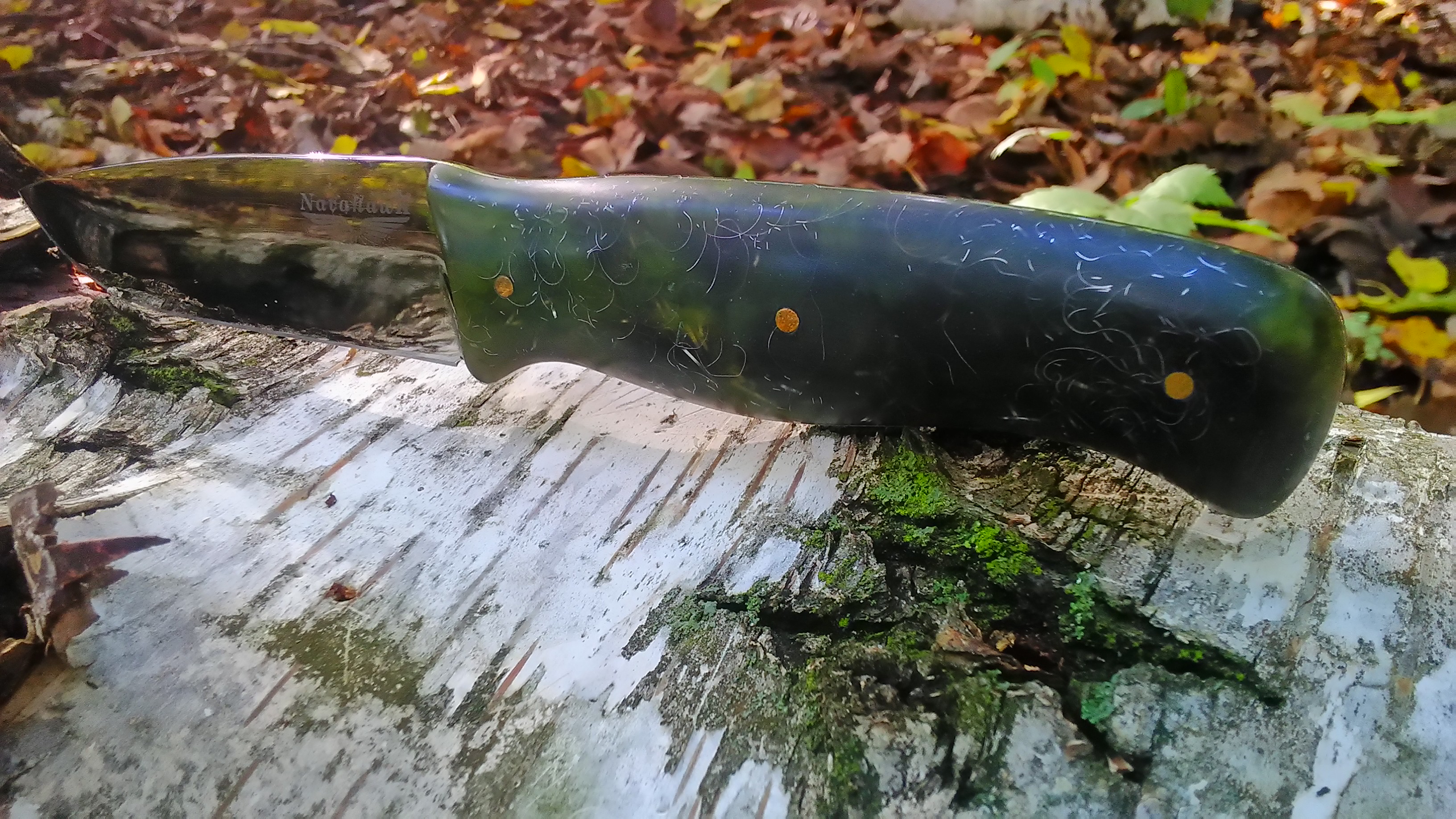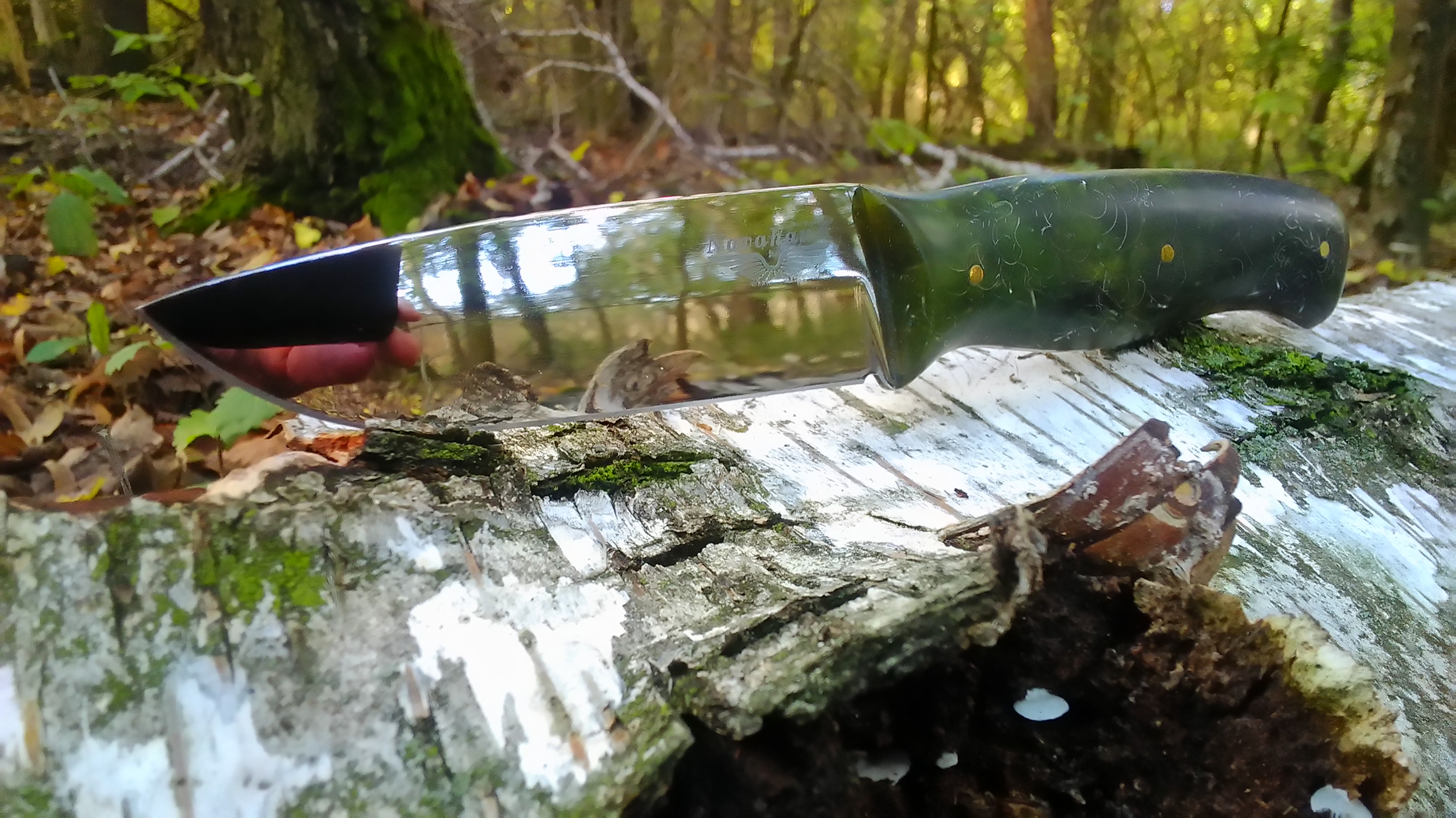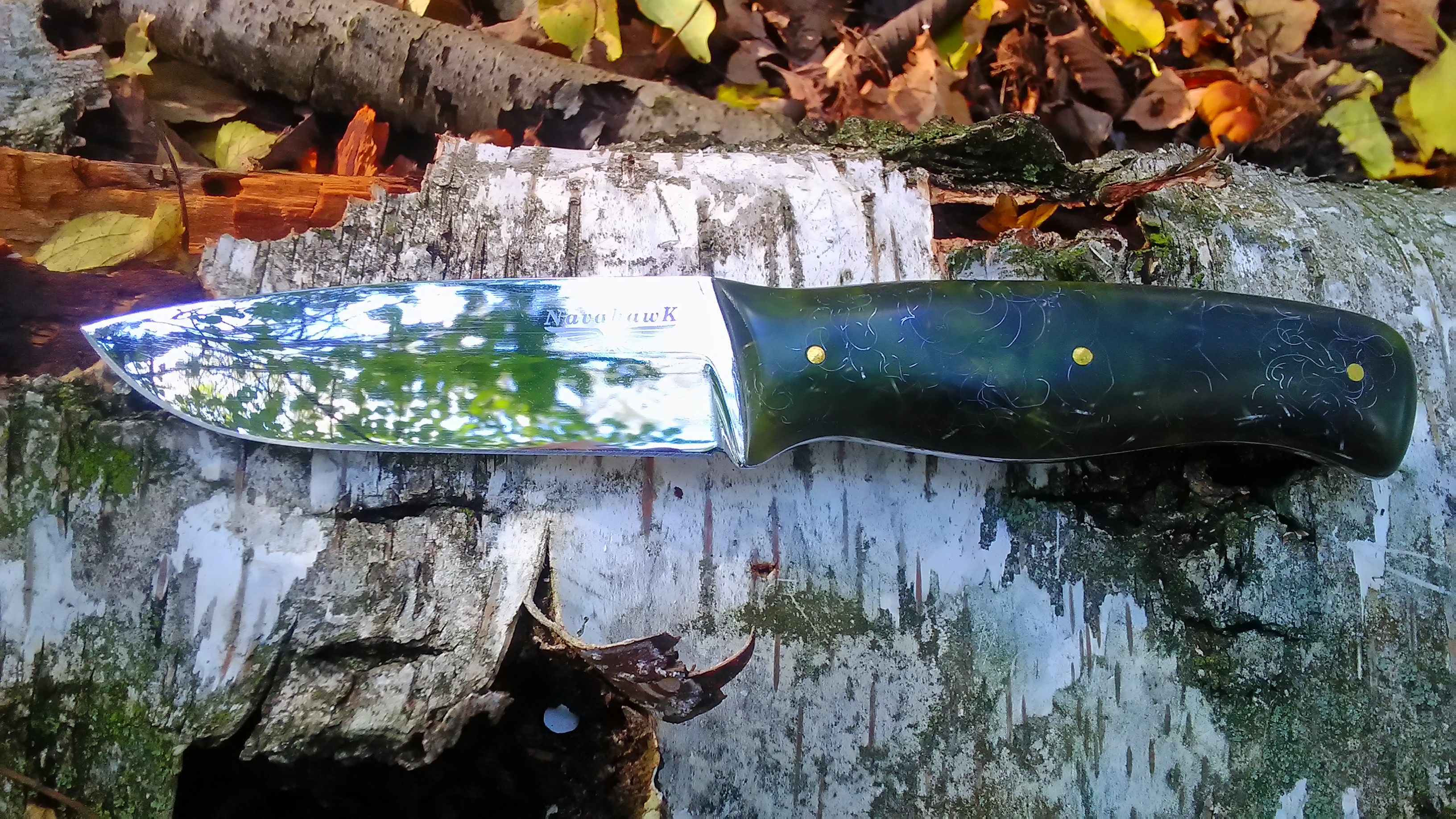 Egyedi kézi készítésű vadásztőr, fa díszdobozban. Anyaga 3mm vastag 1.4116-os rozsdamentes acél (Német acél). Teljes hossza 23cm, ebből a penge hossza 10.5cm.